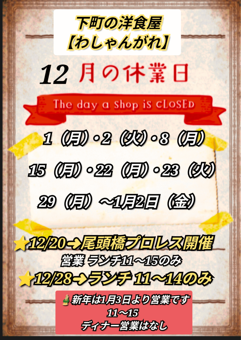 12月及び年末年始の営業予定です。12/19は19時30分閉店です。12/20はイベント開催のためラ […] -